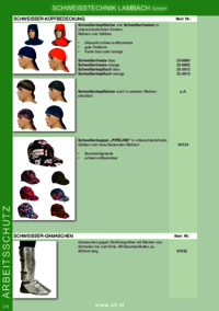 SCHWEISSTECHNIK LAMBACH GmbH SCHWEISSER-KOPFBEDECKUNG Schweißerkopftücher und Schweißerhauben in unterschiedlichsten Farben, Motiven und Größen. • Allesamt schwer entflammbar • gute Paßform • Farbe…