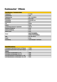 Cutmaster® 35mm Spezifikationen / Technische Daten Ausgangsstrom Ausgangsleistung Eingangsspannung Einschaltdauer Stromaufnahme Werkstückkabel Gas Luftdruck Durchflußmenge (Schweissen & Fugenhobeln)…