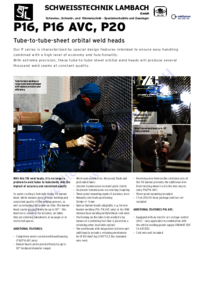 P16, SCHWEISSTECHNIK LAMBACH GmbH Schweiss-, Schneid-, und Wärmetechnik - Spezialwerkstätte und Gaselager P16 AVC, P20 Tube-to-tube-sheet orbital weld heads Our P series is characterized by…